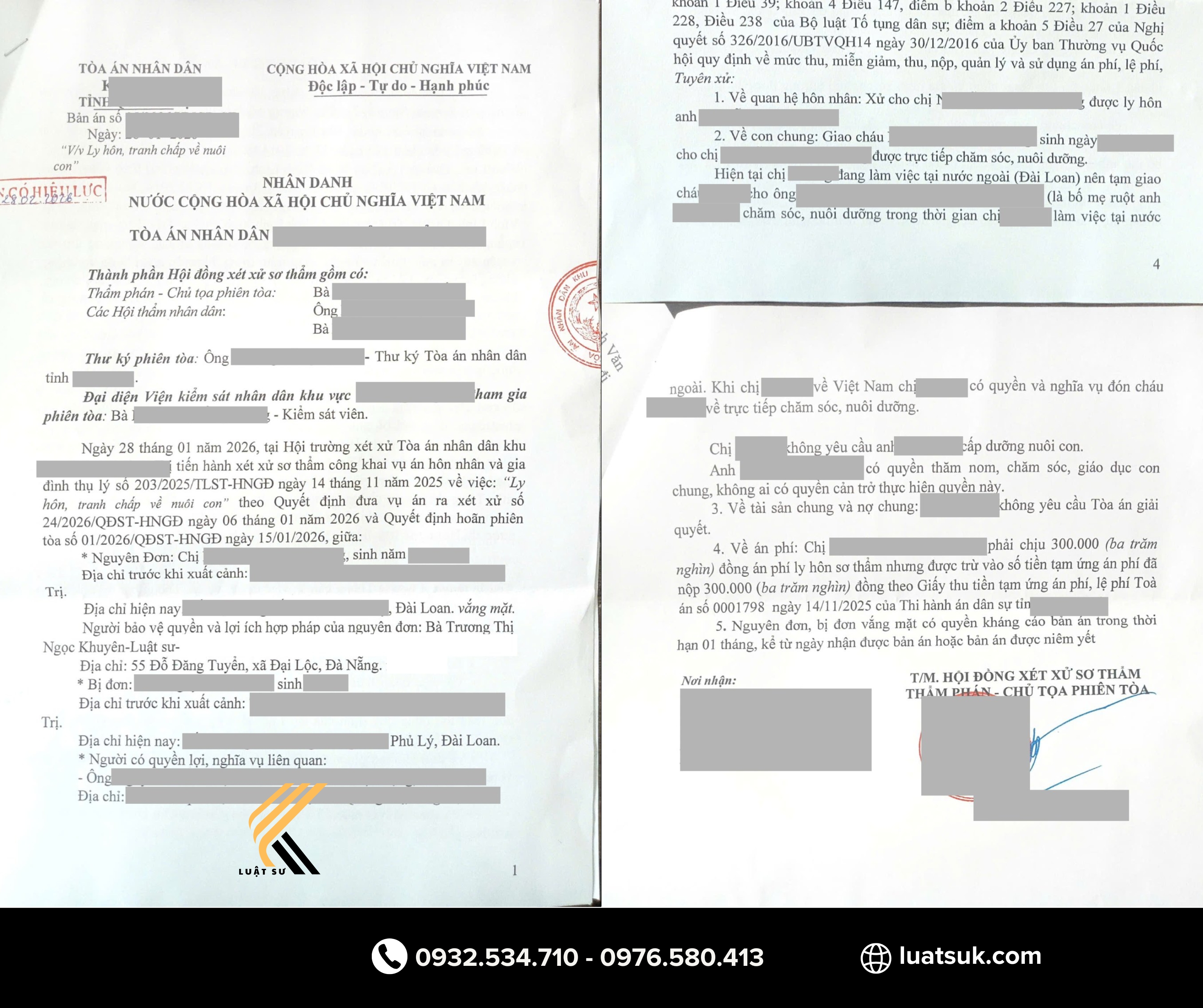 Kết quả: Tòa án chấp nhận cho khách hàng được ly hôn và được giao quyền nuôi con cho khách hàng đang ở Đài Loan. Tạm thời giao con cho bố mẹ chồng nuôi, khi khách hàng về thì được tiếp tục nuôi con.